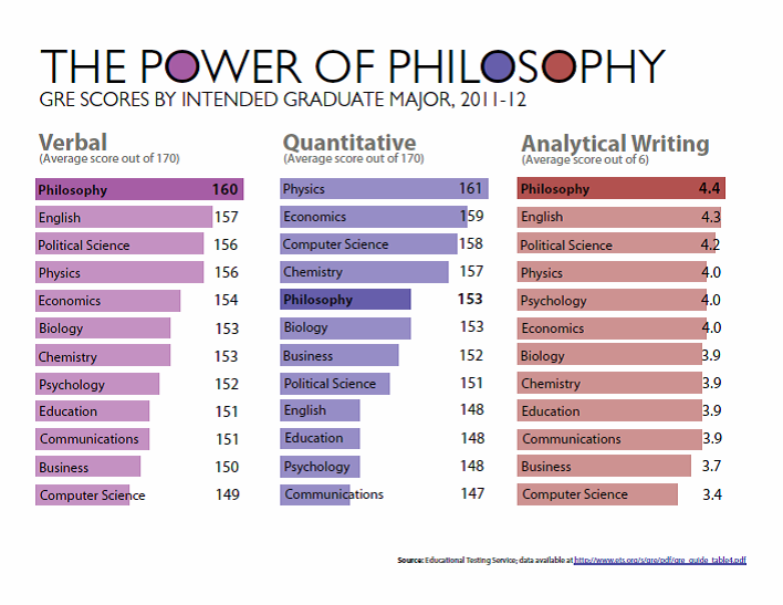 Thus it is not a surprise (at least to me!) that philosophy majors are some of the best with regard to analytical skills, evidenced by the above graphic. According to the Educational Testing Service, which administers the GRE, the analytic writing section tests “critical thinking and analytical writing skills. It assesses [your] ability to articulate and support complex ideas, construct and evaluate arguments, and sustain a focused and coherent discussion.” Philosophy majors are also the best with regard to verbal ability, and the best of the liberal arts students at quantitative reasoning. Simply put, our students have the best all-around intellectual skills.